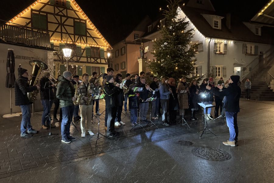 Nach dem Gottesdienst an Heiligabend spielt jedes Jahr eine Gruppe von Musikerinnen und Musikern am Christbaum auf dem Dorfplatz Weihnachtslieder. Weihnachtliche Klänge begleiten Euch und uns nach Hause zu einem schönen Weihnachtsfest. Wir wünschen allen frohe Weihnachten!